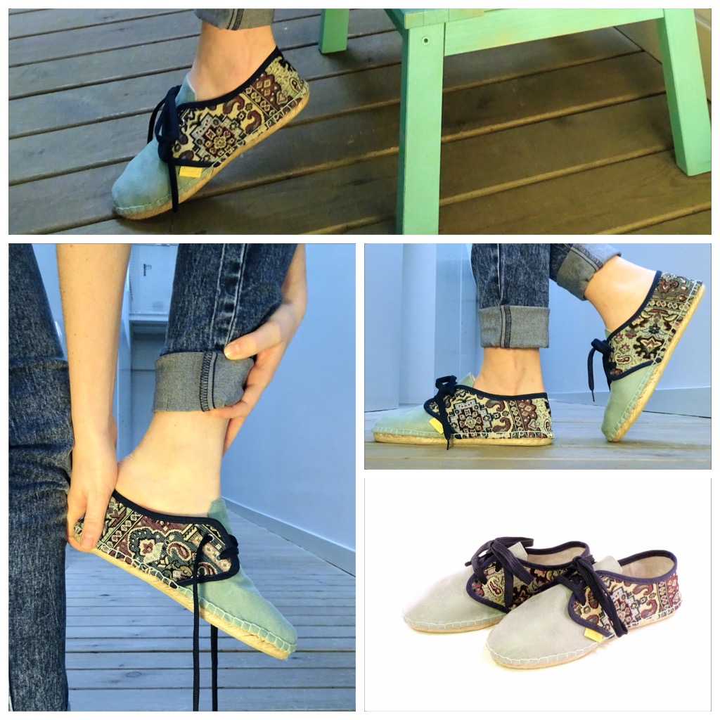Espardeña con cordones cosida a mano en esparto cubierto con goma.